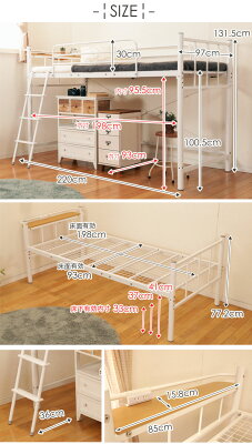 サイズ(約) 幅97×奥行220×高さ131.5cm ・ロフトベッド時:床面高さ100.5cm ・シングルベッド時:床面高さ46/42/38cm(3段階高さ調節) ・床面有効サイズ:約幅93×奥行198cm ・サイドフレームの高さ:約30cm ・棚サイズ:約幅15.8×奥行8.5cm ・はしごステップ幅:約6cm梱包サイズ 1.80×100×17cm 重量:19kg 2.97×79×17cm 重量:16kg 3.123×39×13cm 重量:13kg 材 質 フレーム部分:スチール(粉体塗装) 棚部分:パーチクルボード 組立 お客様組立品:2人45分 生産国 中国 耐荷重 約80kg その他・注意事項 ※2017/12/25 仕様変更のため脚部・ヘッドボード・フットボードのデザイン変更となりました。