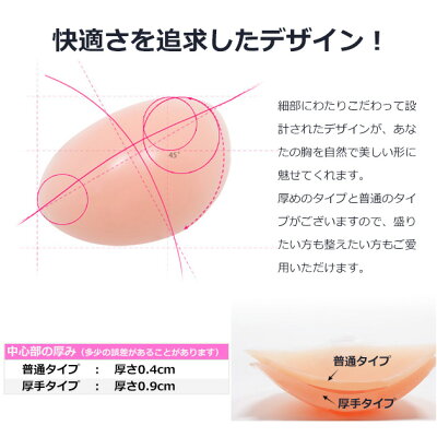対応バストサイズ A・B・C・Dカップ 中心部の厚さ 厚手タイプ:0.9cm 普通タイプ:0.4cm 素材 シリコン樹脂 お手入れ方法 1.中性洗剤を泡立て優しく洗います 2.ぬるま湯で洗剤を洗い流します (爪で傷つけないよう注意!) 3.柔らかいタオルで押さえるように水分を拭き取ります (こすらないように) 4.直射日光を当てないように、換気のよい場所で陰干しします 5.フィルムを貼り付け、乾燥を防ぎます (ホコリが混入すると粘着性が弱まる原因になります) 注意点 ●色合いはモニター環境により若干の誤差が出ます。
